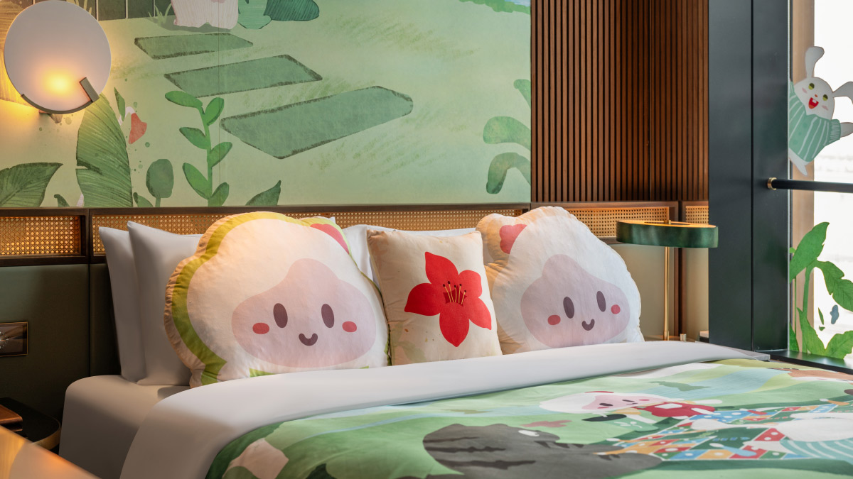 亲子房房型面积32-35平方米,室内装饰充满艺术气息,配备独立淋浴室、定制高端花洒系统、智能马桶、65寸液晶电视、独立岛台式迷你吧、智能小管家“小棉”客房控制系统等,高速无线网络全覆盖。